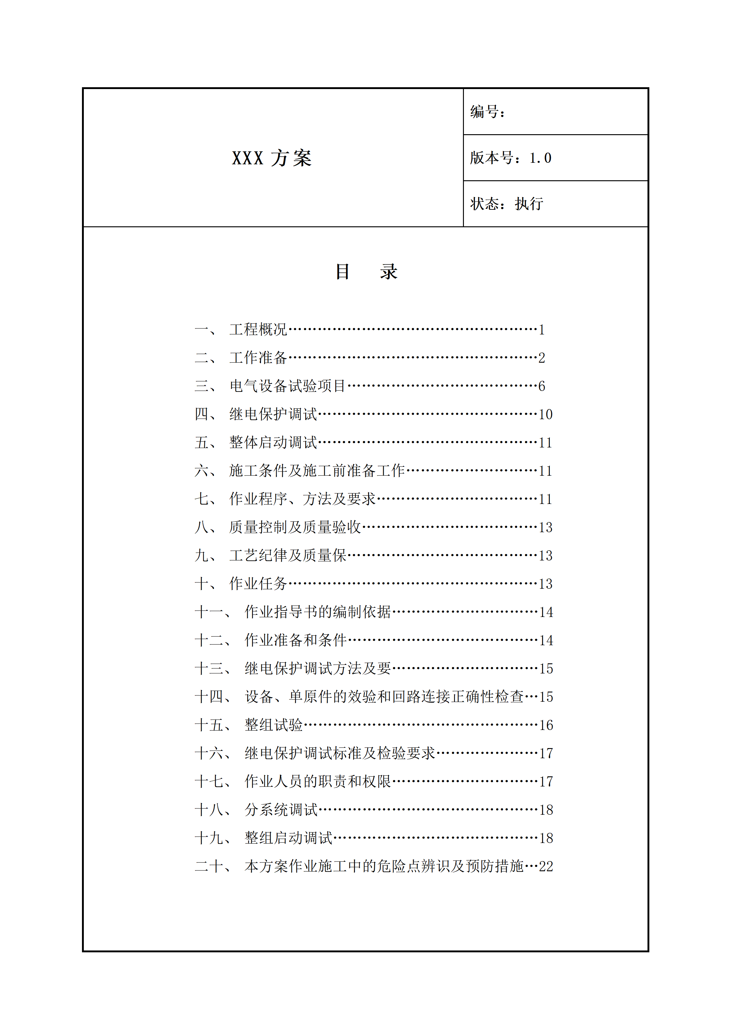 3、方案还包含分系统调试与整组启动调试的完整内容,对同期系统、备用电源自投系统、直流电源系统等分系统调试提出具体操作要求,详细规划了整组启动的前期准备、验收标准,以及母线充电、主变充电、35kV母线及设备充电、站用变充电、箱变冲击试验等全流程启动程序。同时,方案辨识了高压试验、继电试验中的各类作业危险点并制定预防措施,提出现场调试及运行的反事故措施,明确了质量检验标准、质保措施、现场安全要求、操作规范和紧急情况处理流程,全方位保障调试作业开展。