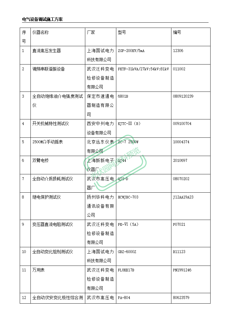 2、方案对调试前期准备工作提出严格要求,明确需组建配备高压、继保专业人员的调试班组并划分岗位职责,同时制定专项技术措施、编制作业指导书,对调试人员的专业资质、试验仪器的计量校验、现场机具及到货设备检查均作出具体规定,还详细罗列了直流高压发生器、继电保护测试仪等各类专业试验仪器的型号与规格。方案明确了主变、避雷器、互感器、电力电缆、二次回路等所有电气设备及元件的常规试验与特殊性试验项目,对继电保护调试单独制定详细细则,规范了绝缘检查、逻辑功能试验等核心作业的流程、方法与质量标准,设置了相应的质量管控节点。