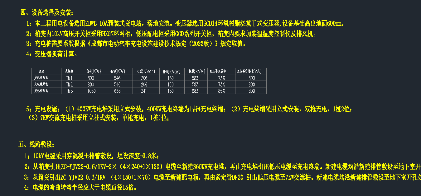 本工程为**新能源汽车充电桩建设项目**充电桩建设工程设计。本次3台800kVA箱变,6台360KW充电堆以及24台双枪充电终端以及34台7kW交流桩以满足客户的新能源汽车充电公共配套服务需求。