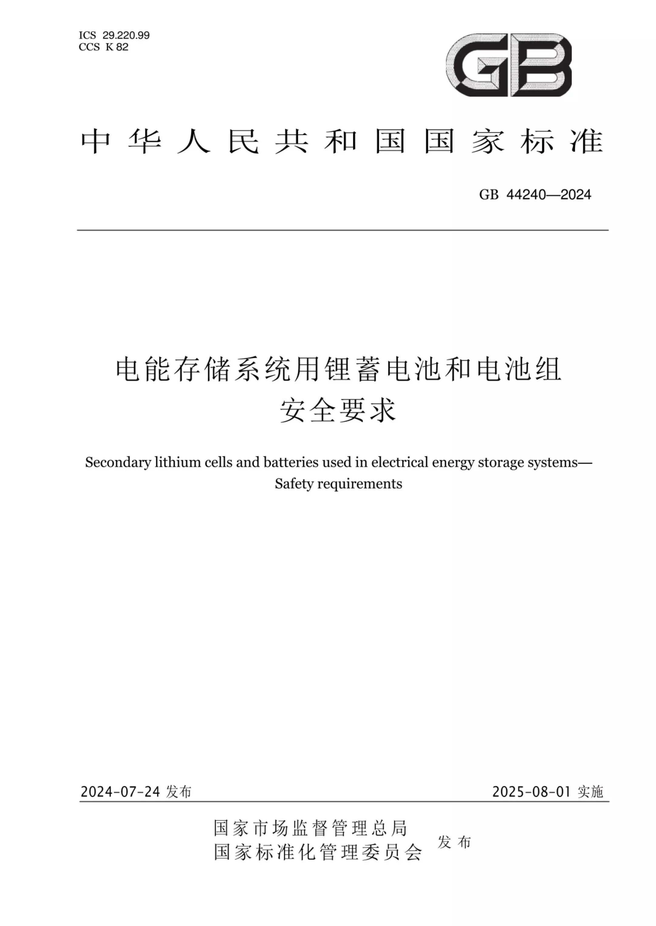 电能存储系统用锂蓄电池和电池组安全要求GB 44240-2024