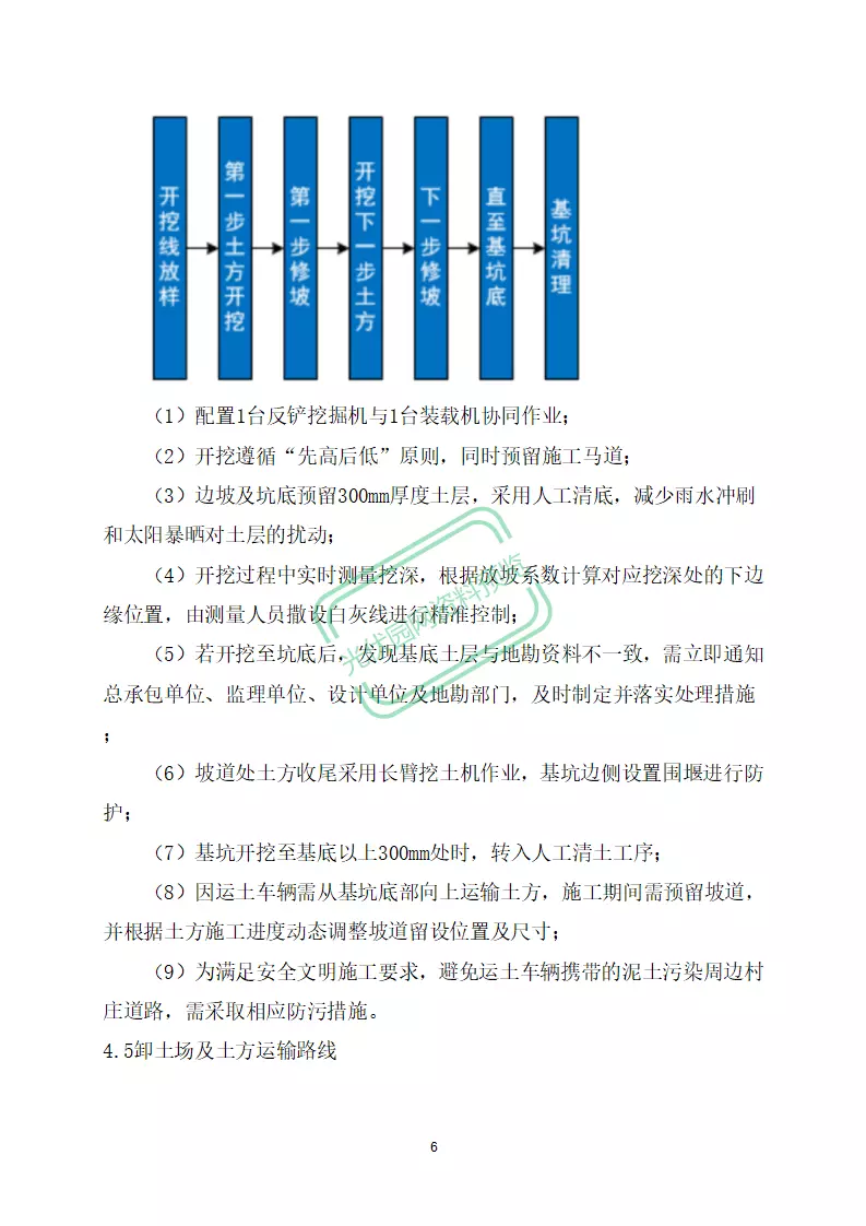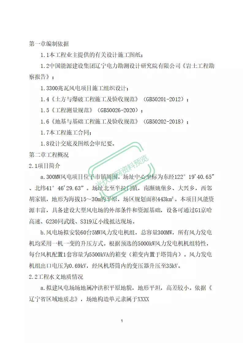 本文档为300MW风电项目风机基础开挖及回填方案,适用于平原地区风电场风机基础施工场景。方案详细涵盖编制依据、工程概况(含项目坐标、地形地貌、水文地质条件及机组配置)、施工准备(技术筹备、组织机构、劳动力与机械设备计划)、施工部署(开挖安排、流程顺序、运输路线及回填要求)、土方施工技术措施、特殊情况应急处理、安全管理及文明施工与环保管理等核心内容,严格遵循《土方与爆破工程施工及验收规范》《地基与基础工程施工及验收规范》等国家标准,为风电项目基础开挖与回填施工提供全面、科学的技术指导和实施依据。