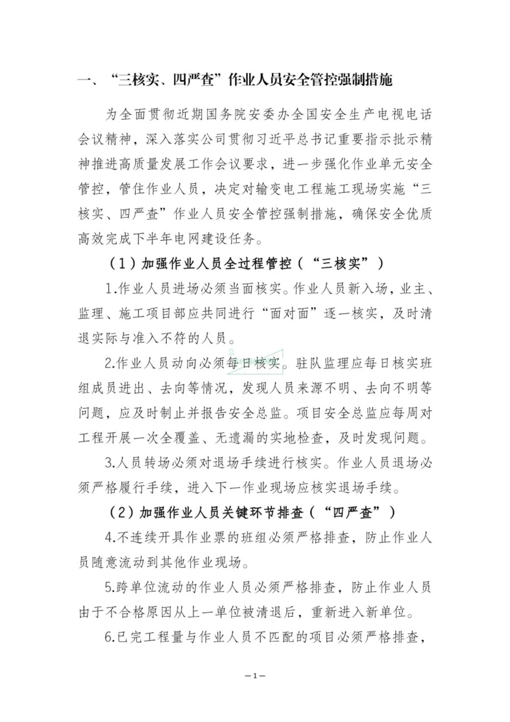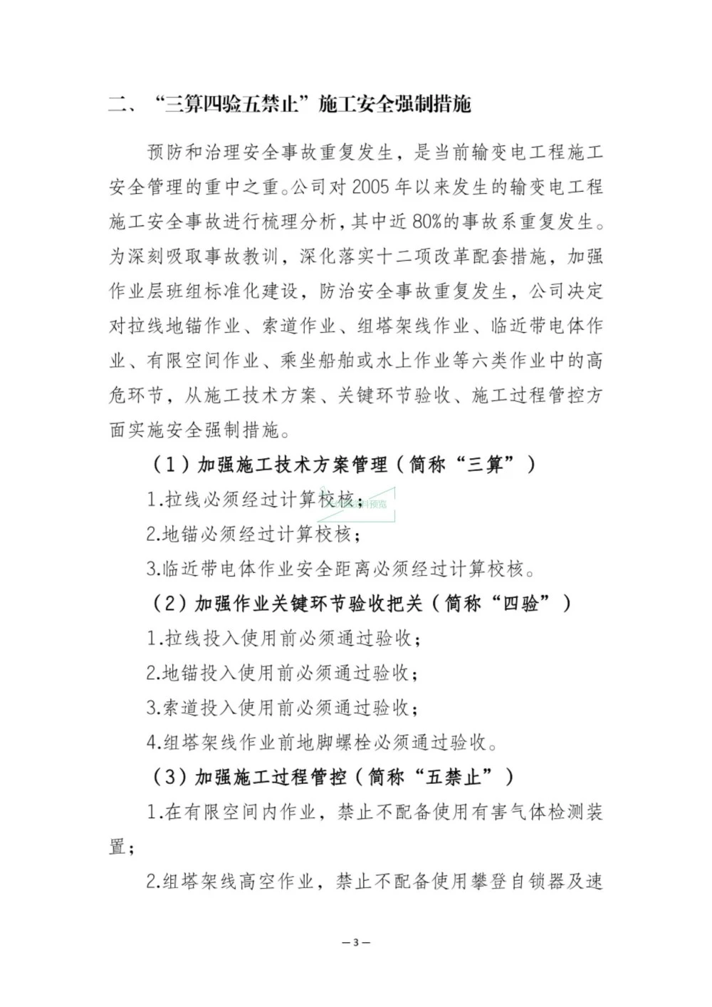 预防和治理安全事故重复发生,是当前输变电工程施工安全管理的重中之重。公司对2005年以来发生的输变电工程施工安全事故进行梳理分析,其中近八成的事故系重复发生。为深刻吸取事故教训,全面推进主动式安全管理,防治安全事故重复发生,国网公司在2020年制定了"三算四验五禁止"安全强制措施,并随后陆续发布了涉及人员管理、铁塔组立高处作业、小型临时分散作业、电动单梁起重机作业、动火作业等多项安全强制措施,为减少安全事故重复发生发挥了积极作用。