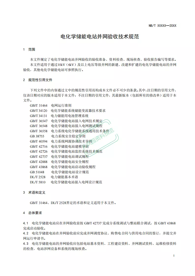 本文件适用于通过10kV(6kV)及以上电压等级并网的新建、改建和扩建的电化学储能电站的并网验收,其他电化学储能电站可参照执行。