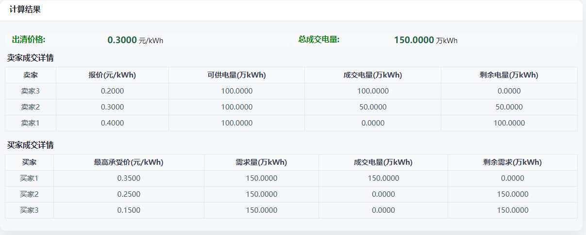 点击“计算出清价格”后,系统会在1秒内完成所有运算:不仅会给出最终的出清价格和总成交电量,还会生成两份明细表格——卖家成交详情表标注了每家企业的报价、可供电量、成交电量及剩余电量;买家成交详情表则清晰呈现最高承受价、需求量、成交电量及未满足需求,谁成交、谁未成交、成交多少一目了然。