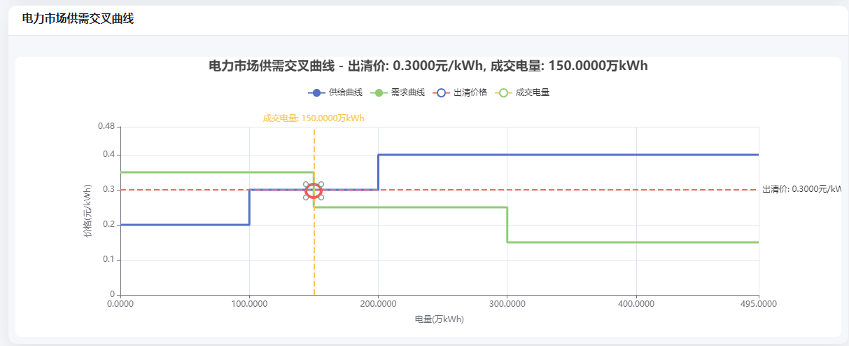 最核心的亮点是工具自带的“供需交叉曲线图”:自动绘制供给曲线、需求曲线,并标注出清价格和成交电量的对应位置,原本抽象的“边际匹配”逻辑,通过图表就能直观看懂。无论是电力市场新手用来学习原理,还是从业者模拟不同供需场景下的出清结果,都能省去繁琐的手动演算,把精力集中在核心的逻辑分析上。