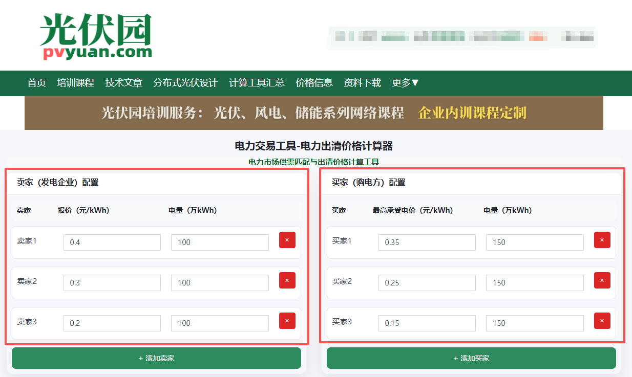 光伏园网的《电力交易工具-电力出清价格计算器》,正是为解决这个问题而生。工具采用清晰的分栏布局,左侧配置卖家信息(输入报价和可供电量),右侧配置买家信息(输入接受价格和需求量),点击“+ 添加卖家/买家”就能灵活增减交易主体,新手也能快速上手。