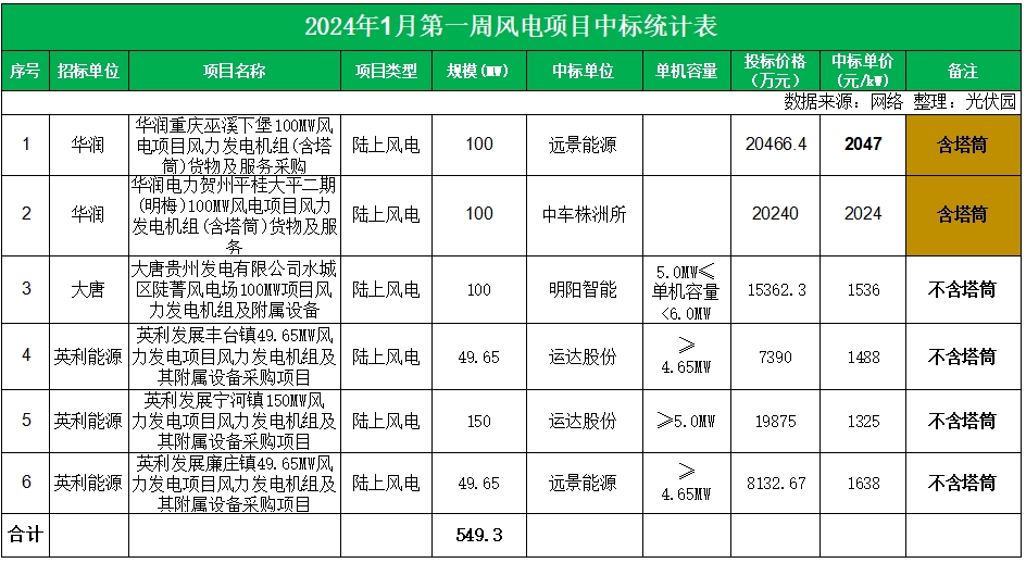 风电系统(含塔筒)最低中标单价2.04元/W,均价2.035元/W。
