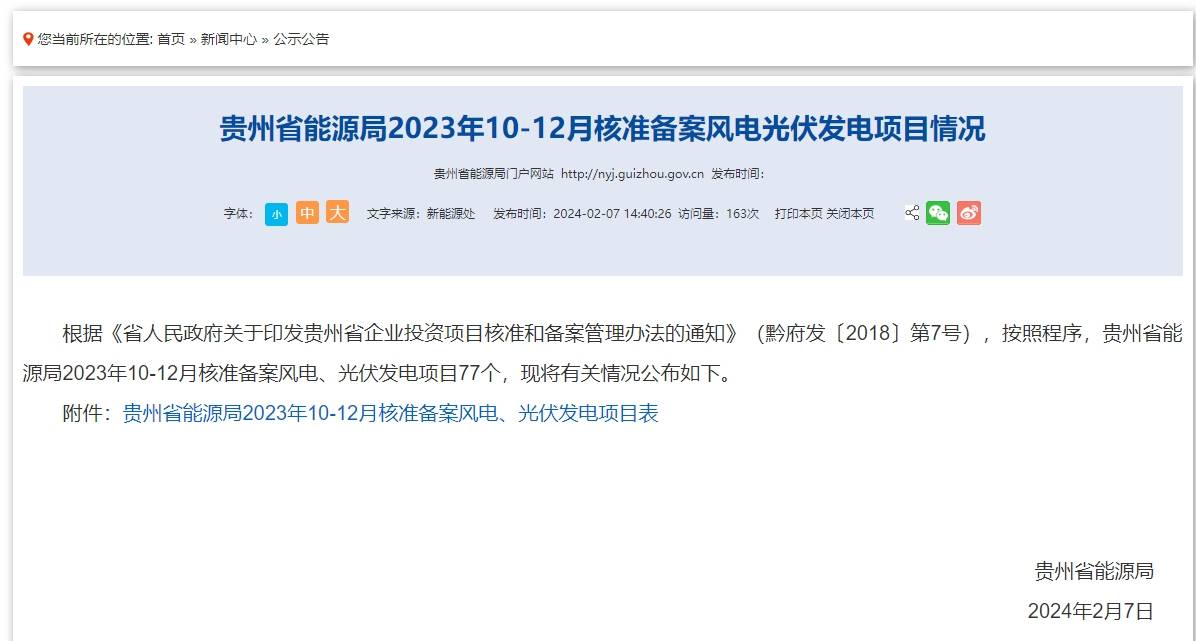 光伏园获悉,2024年2月7日贵州省能源局发布《贵州省能源局2023年10-12月核准备案风电光伏发电项目情况》。